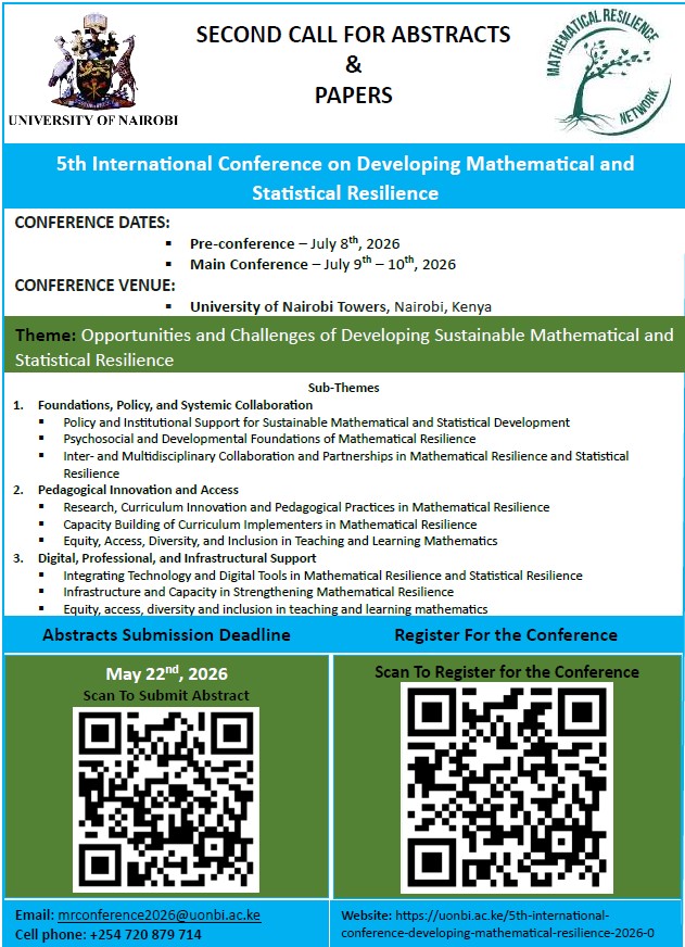 The University of Nairobi, through the Faculty of Education, will host the fifth International Conference on Developing Mathematical Resilience. The Conference will be held on July 8 -10, 2026. It will anchor on opportunities and challenges of developing sustainable mathematical and statistical resilience. The focus areas will be on policy, multidisciplinary collaboration and partnerships; research, curriculum innovation and pedagogical Practices; integrating technology and digital tools; equity, access, diversity and inclusion; and Institutional support for sustainable mathematical and statistical development